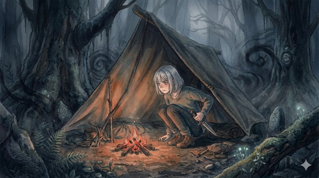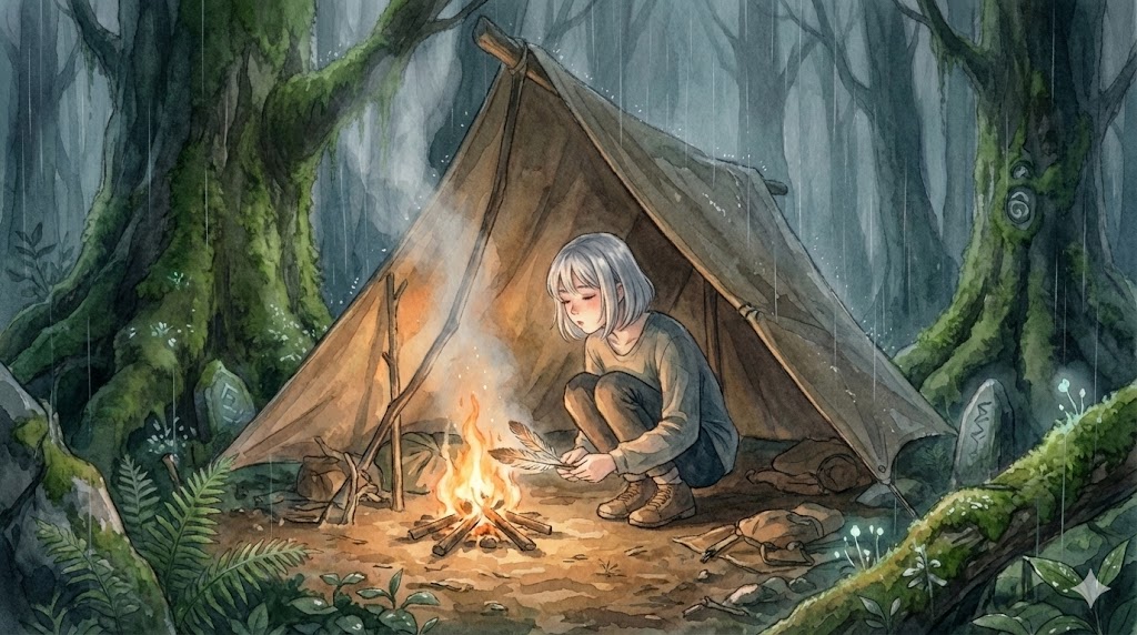 けれど、この小さな布の下だけには、爆ぜる薪の音と、雨粒が布を叩くリズム、そして温かな光があった。