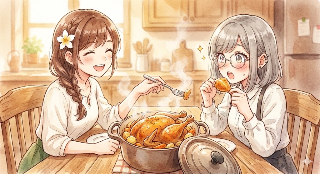重たい蓋が開かれた瞬間、白い湯気と共に、黄金色に輝くローストチキンが姿を現しました。