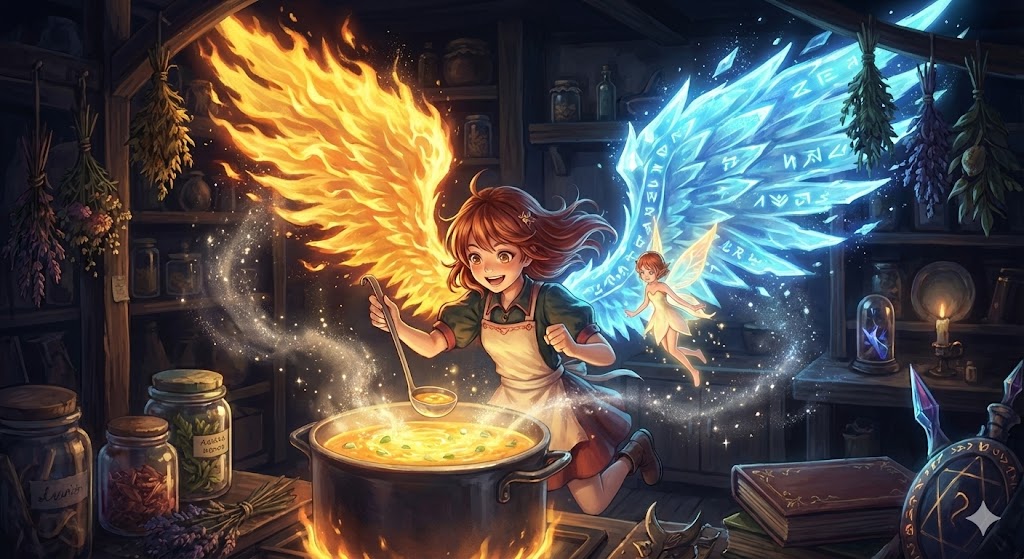 リョウリが完成させたスープの表面には、二つの翼を広げた聖女のような影が、一瞬だけ優しく微笑んでいた。
